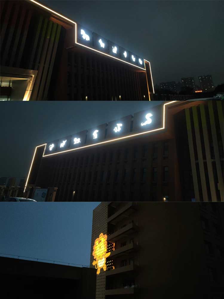 簡(jiǎn)介—— 西安市兒童福利院亮化工程,主要是采用線條燈對(duì)樓體的頂部和側(cè)面輪廓進(jìn)行勾勒,主樓安裝十二生肖發(fā)光造型,側(cè)墻采用圖案燈進(jìn)行動(dòng)畫投影,打出絢麗多彩的動(dòng)畫卡通人物,與建筑的實(shí)用完整結(jié)合。